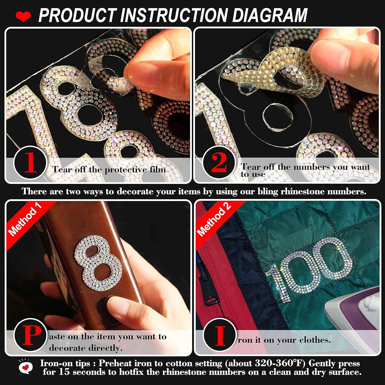 - Self-adhesive + Iron-on